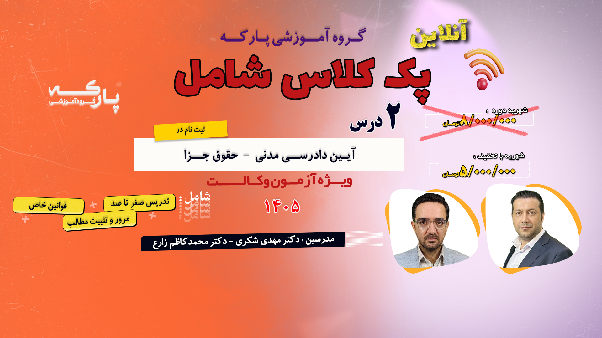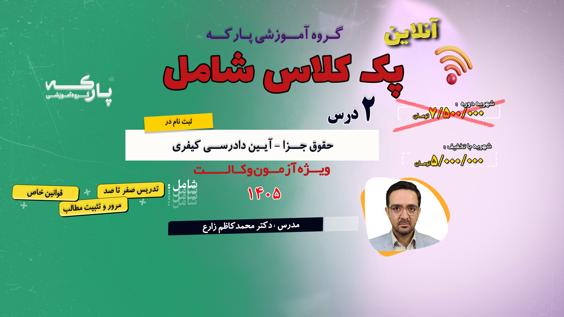 پک خدمات گروه آموزشی پارکه شامل: 550 ساعت کلاس آنلاین ویژه تمامی دروس آزمون وکالت 16 مرحله آزمون آزمایشی طراحی سوالات توسط...